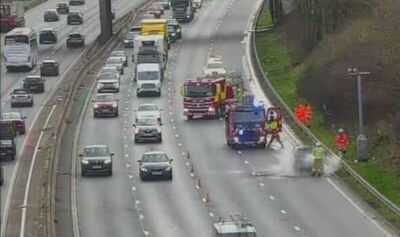 M56 traffic: Car explodes into flames with lanes closed and severe delays