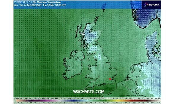 Meanwhile, the lowest temperatures in England look set to range from around 4 to 7C in southern areas at this time, though it could be below zero between the North West and North East.