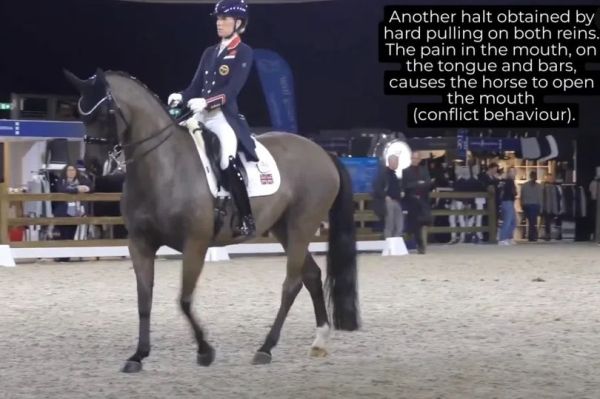 The clip states: “Constant traction on both reins may cause pain in the horses’ mouth, jaw, poll and neck.” They also say: “Spurs should not be used to kick horses but to apply only very light, painless pressure.”