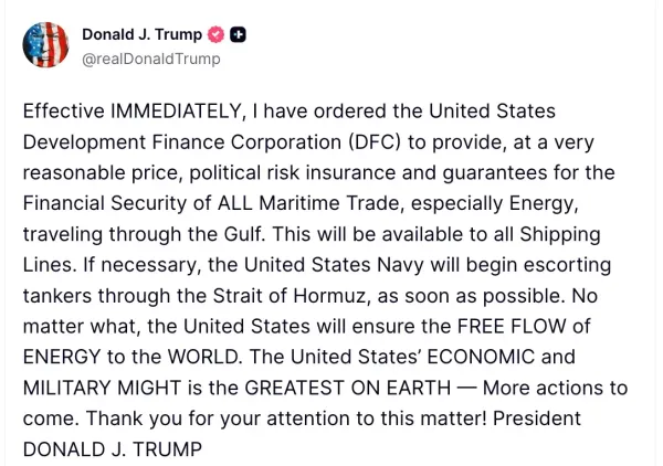 “Effective IMMEDIATELY, I have ordered the United States Development Finance Corporation (DFC) to provide, at a very reasonable price, political risk insurance and guarantees for the Financial Security of ALL Maritime Trade, especially Energy, traveling through the Gulf,” Trump said in the post.