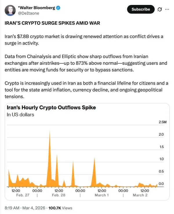 Separately, blockchain analytics firm Elliptic reported that crypto-asset outflows from Iranian exchanges surged by more than 700% within minutes of the initial U.S.-Israeli airstrikes on Saturday. The company highlighted activity from Nobitex, Iran’s largest crypto exchange, where outgoing transactions spiked sharply immediately after the attacks.