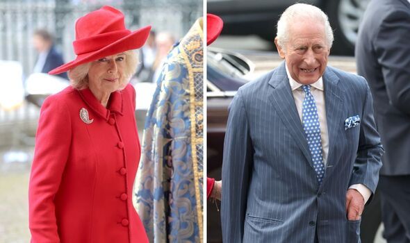 The King and Queen, who wore a bright red coat by Fiona Clare, a matching hat by Philip Treacy and a palm leaf brooch that once belonged to The Queen Mother, arrived last.