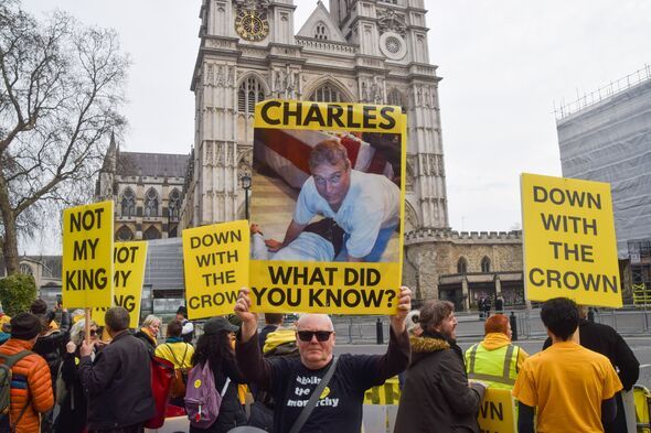 Dozens of campaigners held huge yellow placards that read "Abolish the monarchy", "Not my King" and "Down with the crown", while the group's CEO Graham Smith led the chant: "Charlie, Charlie, time to go." Another sign read "What did you know?", in relation to the King's brother's recent arrest on suspicion of misconduct in public office.