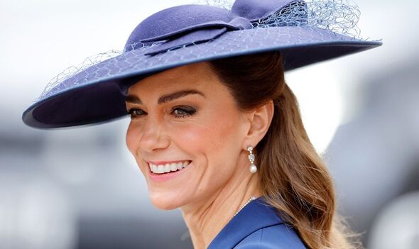 She accessorised her look with a large-brimmed Sean Berret hat and a striking pearl necklace by Susan Caplan. Catherine styled her hair in her signature loose waves and sported a smoky eye make-up.