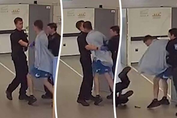 Footage released by Bedfordshire Police shows Moriarty being restrained by one officer in the waiting room. As Special Constable Capener walks in, Moriarty immediately headbutts him in the face. The impact causes both men to fall to the floor unconscious.