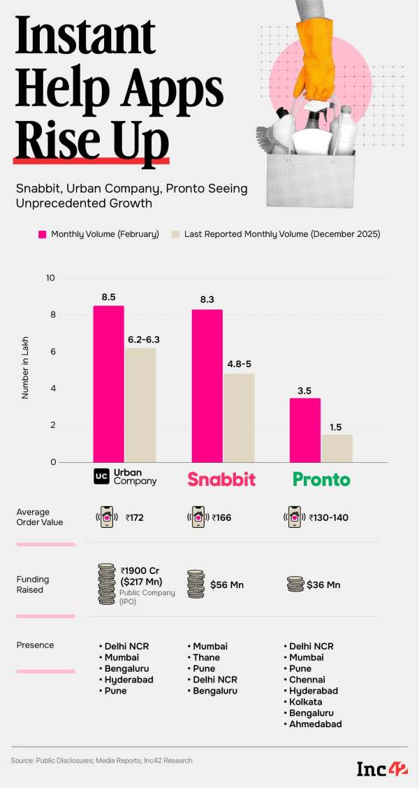 Snabbit claims it touched 8.3 Lakh monthly orders in February 2026, slightly lower than Urban Company’s volume of 8.5 Lakh orders, while Pronto, according to multiple media reports, is doing 3.5 Lakh orders every month.