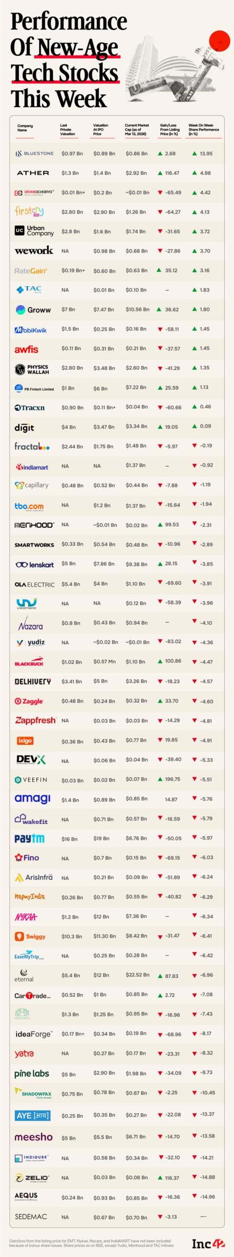 The Indian equities market continued to suffer amid the ongoing conflict in West Asia, resulting in continued selling pressure on new-age tech stocks as well this week. The total market capitalisation of 54 new-age tech companies slumped over $5 Bn to $115.94 Bn at the end of the week.