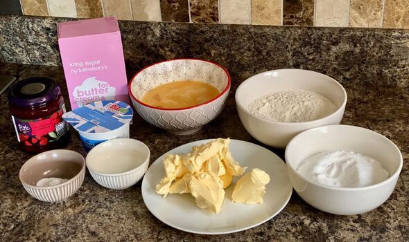 To prepare the sponge, as mentioned earlier, it's a straightforward all-in-one method that involves breaking the eggs into a large mixing bowl, then adding the sugar, flour, baking powder and cold baking spread.