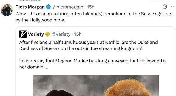 In view of his 8.7 million followers, Piers wrote, "Wow... this is a brutal (and often hilarious) demolition of the Sussex grifters, by the Hollywood bible."