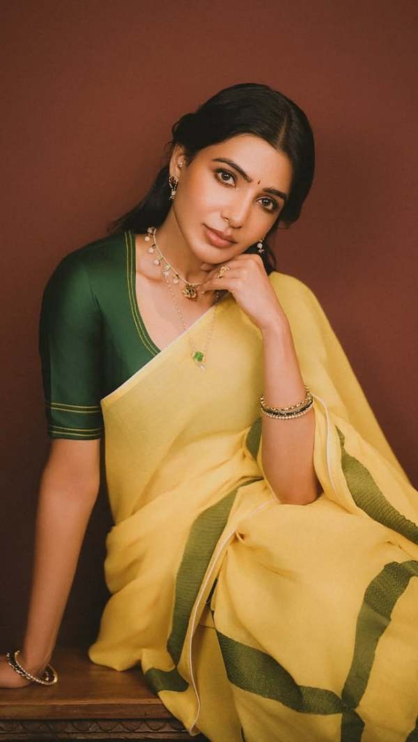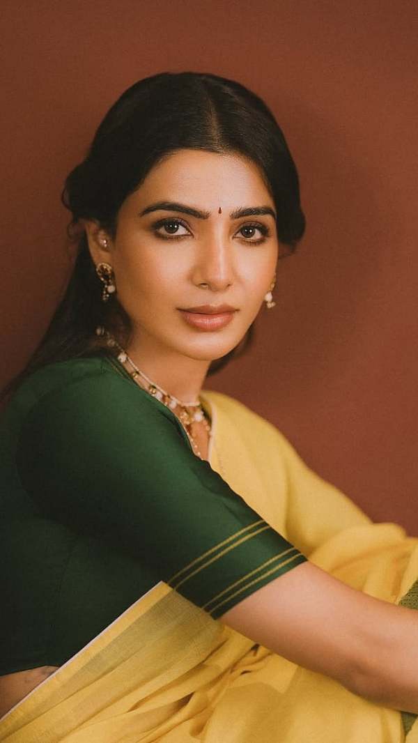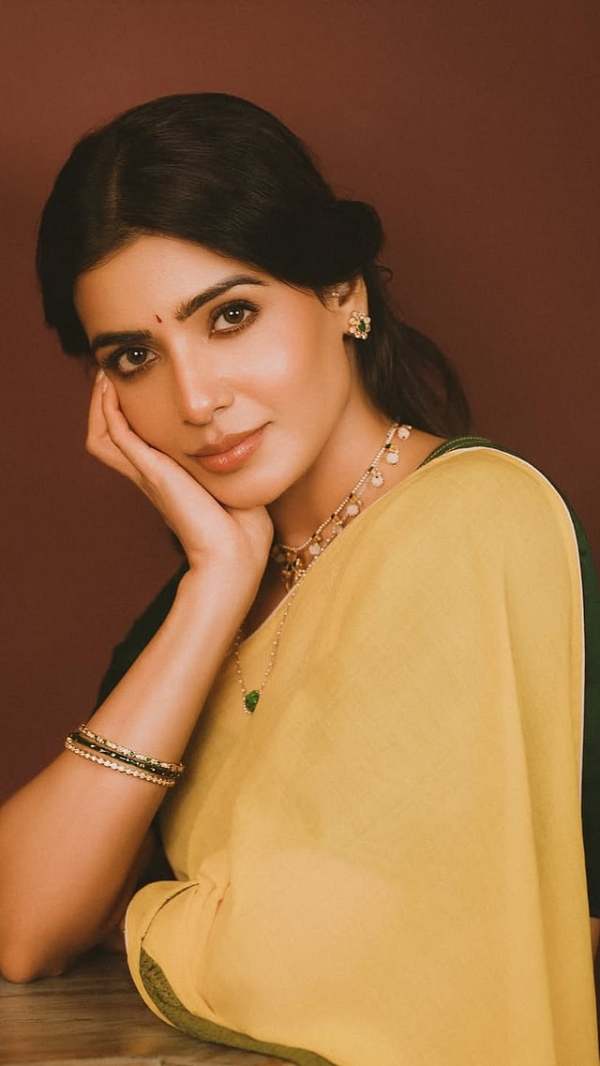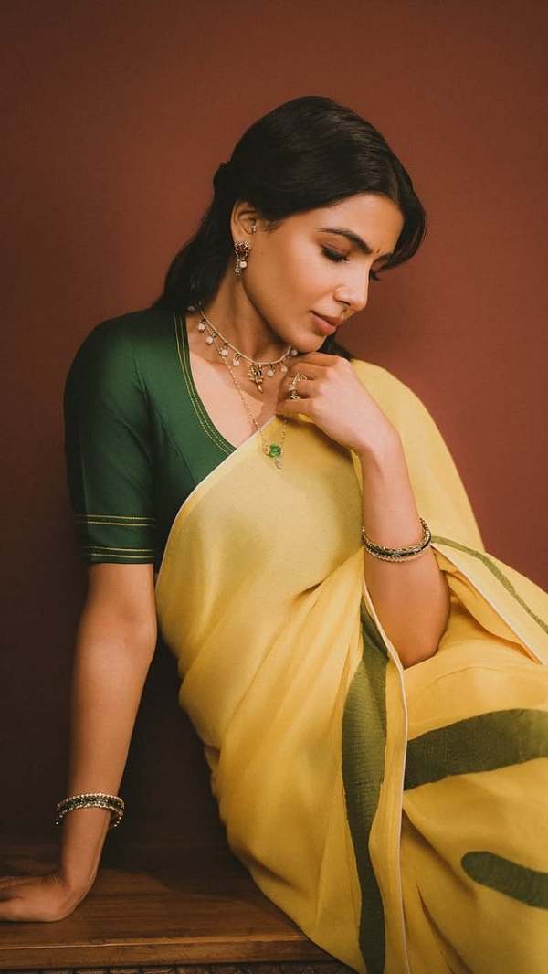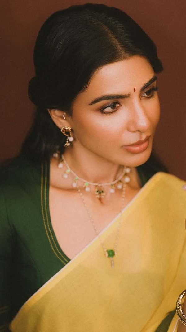 Samantha elevated the look with traditional jewellery, including green bangles, gold kadhas, rings, a choker layered with a fine chain, and coordinated earrings