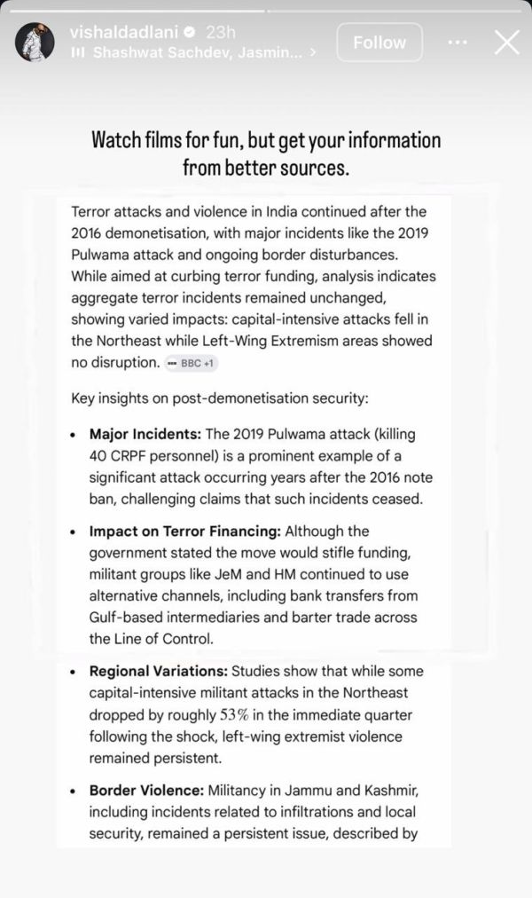 Vishal Dadlani Takes A Sly Dig At Dhurandhar: The RevengeTaking to Instagram, Vishal Dadlani shared a story and wrote, “Watch films for fun, but get your information from better sources”.