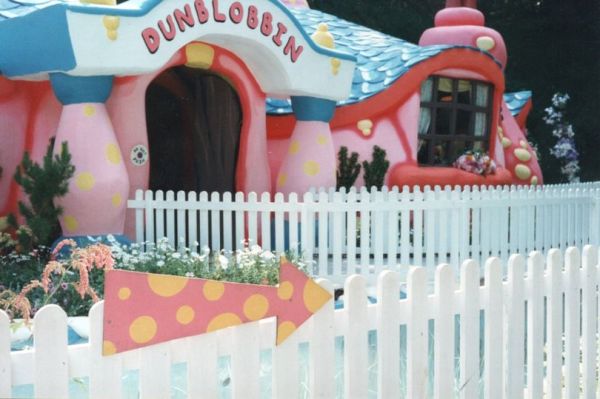 Dunblobbin, painted vivid pink with yellow spots and a blue roof, was encircled by a white picket fence and boasted windowsills decorated with flourishing plastic flowers.