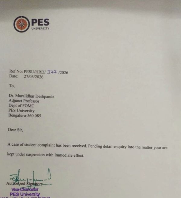 The video’s virality prompted the immediate suspension of the professor. “A case of student complaint has been received. Pending a detailed enquiry into the matter, you are kept under suspension with immediate effect,” read a letter signed by Vice Chancellor, Surya Prasad J.