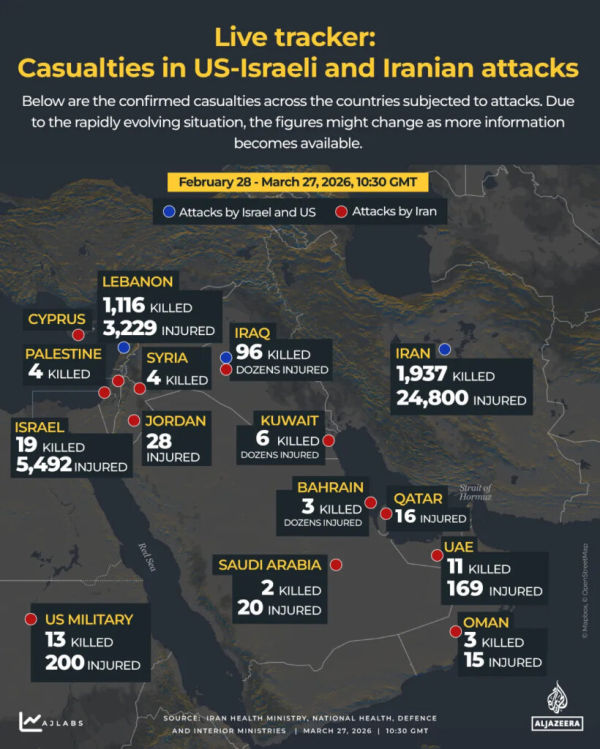 More than 3,000 people have been killed in the war that began with US and Israeli strikes on Iran that triggered Iranian attacks on Israel and neighbouring Gulf Arab states.