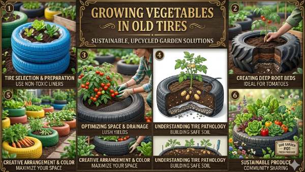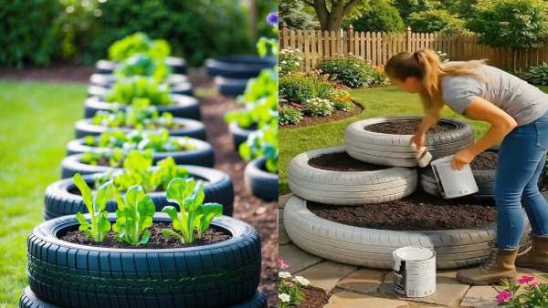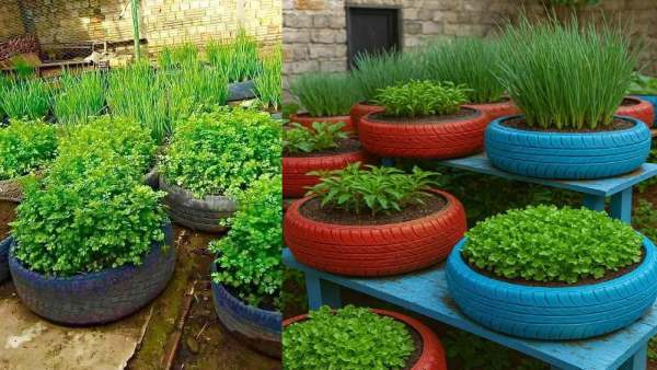 Small tomato and capsicum plants can also be grown in tyres. They need good sunlight and regular watering. Providing small amounts of fertilizer and natural nutrients to plants ensures good yields. In tire garden, these vegetables give good results even in less space.