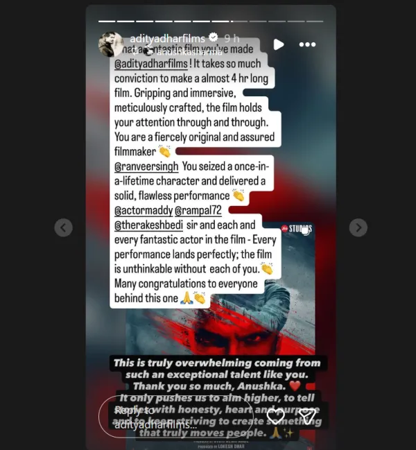 Reacting to Anushka Sharma’s post, Aditya Dhar wrote, ‘We are truly overwhelmed to receive this praise from an extraordinary talent like you. Thank you very much, Anushka. It inspires us to aim even higher, to tell stories with honesty, heart and purpose, and to continue to create works that truly touch people.’ This post of Aditya Dhar is becoming quite viral on social media.
