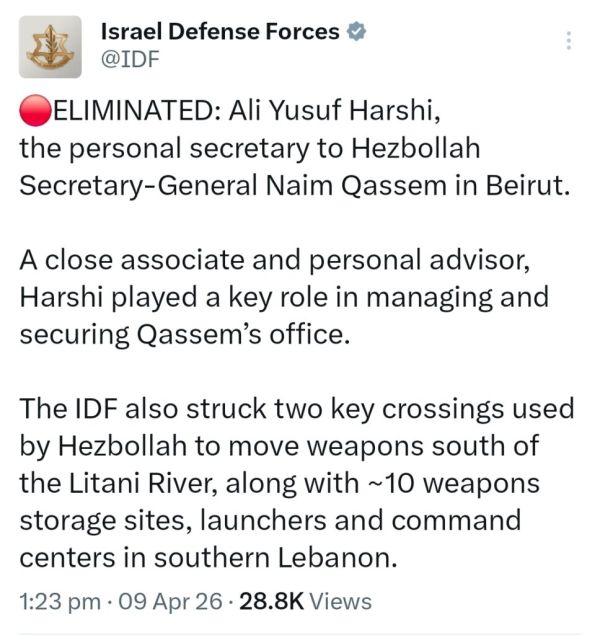 The Israel Defense Forces (IDF) on Thursday, April 9, claimed that it has killed Ali Yusuf Harshi, the personal secretary and nephew of Hezbollah Secretary-General Naim Qassem, in a strike in Beirut.