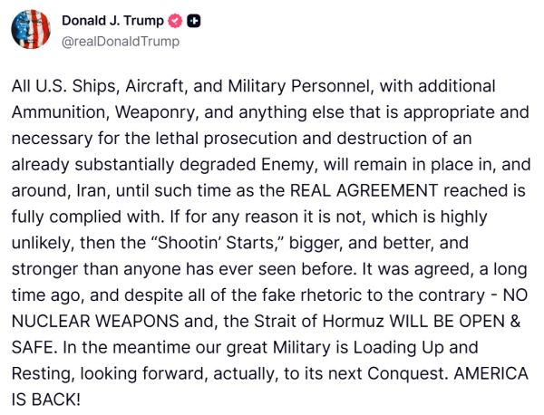 In a post on Truth Social, Trump said: “All U.S. Ships, Aircraft, and Military Personnel… will remain in place in, and around, Iran, until such time as the REAL AGREEMENT reached is fully complied with.”