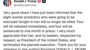 "Very good news!" Trump wrote on Truth Social. "I have just been informed that the eight women protestors who were going to be executed tonight in Iran will no longer be killed. Four will be released immediately, and four will be sentenced to one month in prison."
