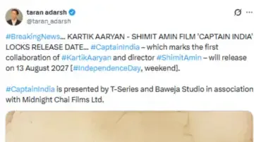 Film critic and movie trade analyst Taran Adarsh took to X (Formerly Twitter) and announced the movie's release date. He wrote Captain India, starring Kartik Aaryan and directed by Shimit Amin, has locked its theatrical release for August 13, 2027, strategically timed around the Independence Day weekend. The film marks the first collaboration between Kartik and Amin. Backed by T-Series and Baweja Studios, the project is being presented in association with Midnight Chai Films Ltd..